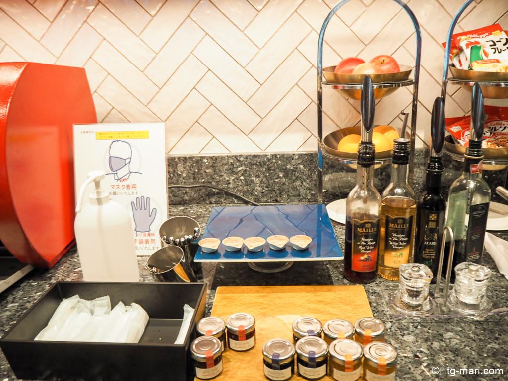 クラブラウンジでは、コロナ対策のため食事を取り分ける際はマスクとビニール手袋を着用するように徹底されていました。また、消毒液も随所に置かれていて、ソフトドリンク類がペットボトルやビンで置かれていることなどもコロナの面で安心できました。